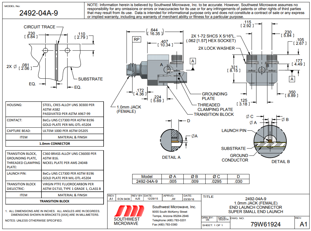 引腳/電媒質直徑不低于:0.005 / 0.0290