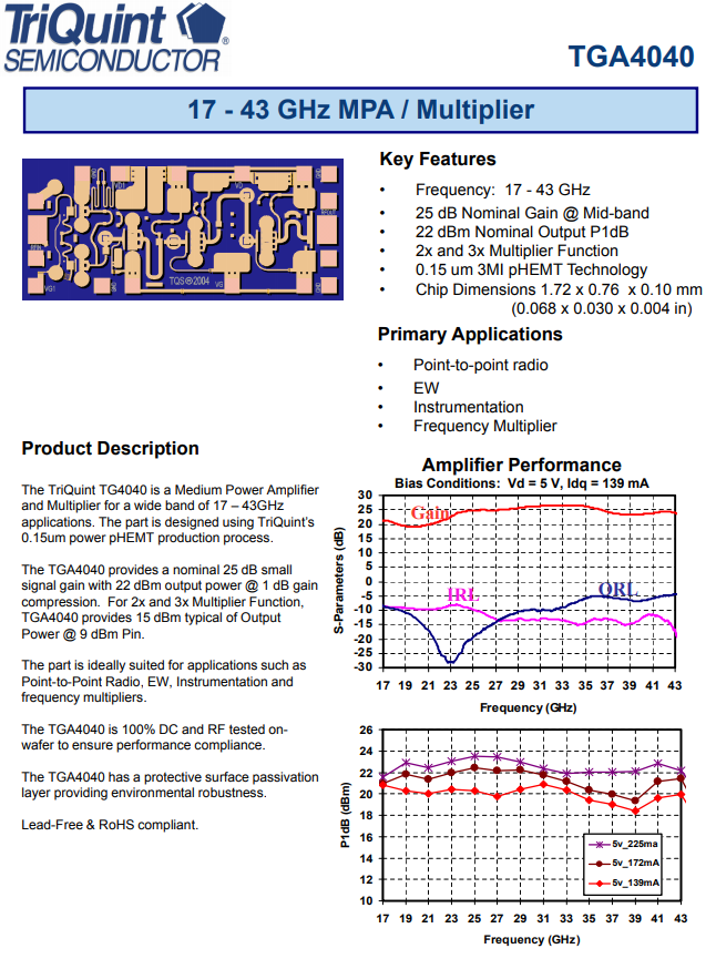 TGA4040頻射擴大器是Qorvo大公司代言食品,而Qorvo子公司是其他國家著名研發團隊放縮器工業企業,跟隨者今天發展趨勢迅速最新枝術要領,帶來行業內最明顯、最具有創意的 GaN-on-SiC 企業產品搭配,促進加盟商有效加快做工作效率和做工作帶寬的配置,科研企業產品變得越來越越充分考慮效果及加盟商的標準,TGA4040頻射縮放器是17-43 GHz收獲塊2x和3x乘數,高機械性能及軟件應用使TGA4040愈來愈越受國際性親睞